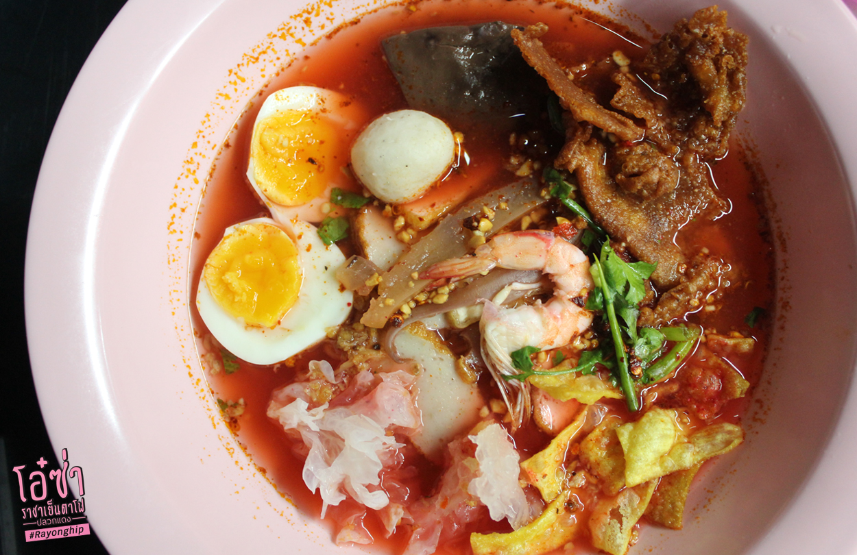 เย็นค่ำหม่ำริมทาง เต็มปากเต็มคำที่ร้าน “โอ๋ซ่า ราชาเย็นตาโฟ” ร้านเย็นตาโฟ สีชมพูสดใสตั้งอยู่ริมทาง แถวสะพานสี่ ปลวกแดง ระยอง วันนี้ระยองฮิพ ได้ลองเมนู “โอซ่า” ที่ไม่ใช่เย็นตาโฟใส่โซดา แต่เป็นเย็นตาโฟแบบต้มยำที่มาพร้อมกับเครื่องและไข่ต้ม เสิร์ฟในชามใหญ่ (฿50) รสชาติแซบใช้ได้เลยครับ เปรี้ยวหวานเผ็ด แต่จะออกไปทางหวานนิดๆ แป้งกุ้งกรอบรสเข้มมากๆ