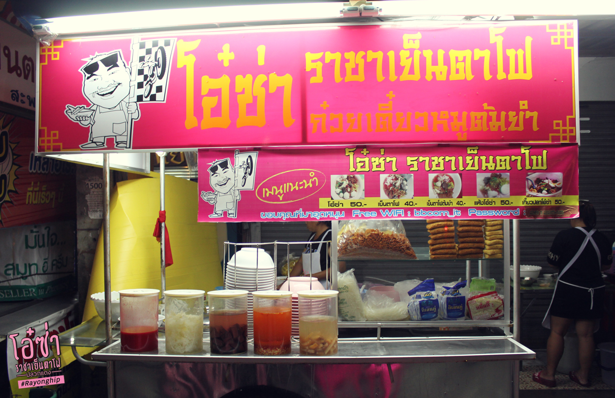 ร้านโอ๋ซ่า ราชาเย็นตาโฟ ป้ายร้านสีชมพูหวานแหวว มีรูปการ์ตูนล่ำบึ้ก ถือธง สืบทราบมาว่าเจ้าของเป็นนักแข่งรถมอเตอร์ไซด์วิบากแชมป์หลายถ้วยซะด้วย โอ๋ซ่าก็มาจากชื่อเจ้าของร้าน ไม่ได้มาจากเย็นตาโฟ(ใส่)โซดา เพื่อความซ่าแต่อย่างใด สูตรเย็นตาโฟก็ได้มาจากคุณแม่ที่เคยขายอยู่กรุงเทพฯ แล้วเอามาปรับสูตรอีกนิดหน่อย เมนูทางร้านก็มีทั้ง เย็นตาโฟ (฿40) แห้งโอ๋ซ่า (฿50) เกี๊ยวปลาโอ๋ซ่า (฿50)